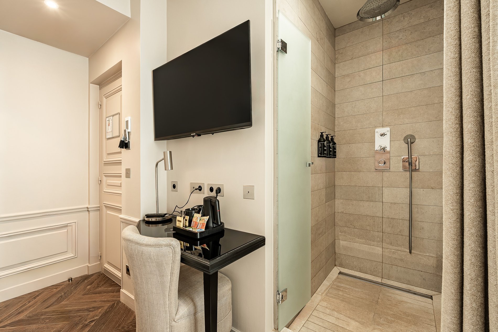 Inspired by Parisian elegance, they harmoniously blend classic refinement with contemporary comfort. Soft colors, ceiling moldings, baseboards, and oak parquet flooring create a warm and authentic atmosphere conducive to relaxation.