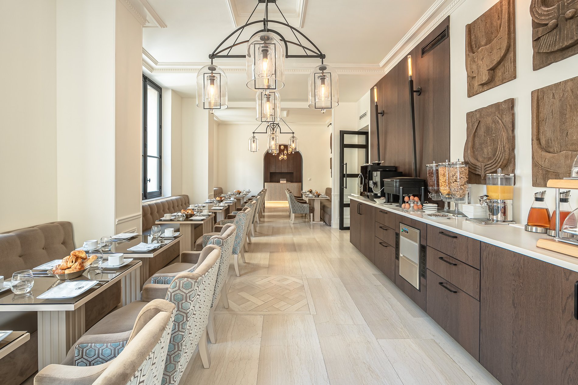 Située au rez-de-chaussée, la salle de petit-déjeuner de notre hôtel de charme à Paris 6ème vous invite à commencer la journée dans une atmosphère élégante et raffinée.
